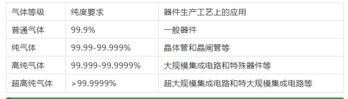 根據氣體純度的不同,通常又將氣體純度分為四級,即普通氣體、純氣體、高純氣體和超高純氣體,下表給出氣體純度等級和器件生產工藝上的應用。